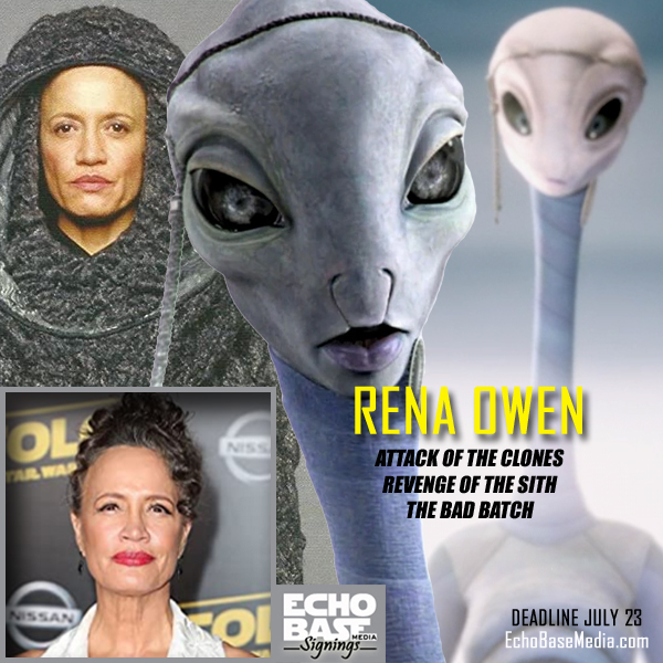 RENA OWEN (Taun We in Star Wars Episode II: Attack of the Clones & The Bad Batch; Nee Alavar in Star Wars Episode III: Revenge of the Sith) will be signing this Summer!
